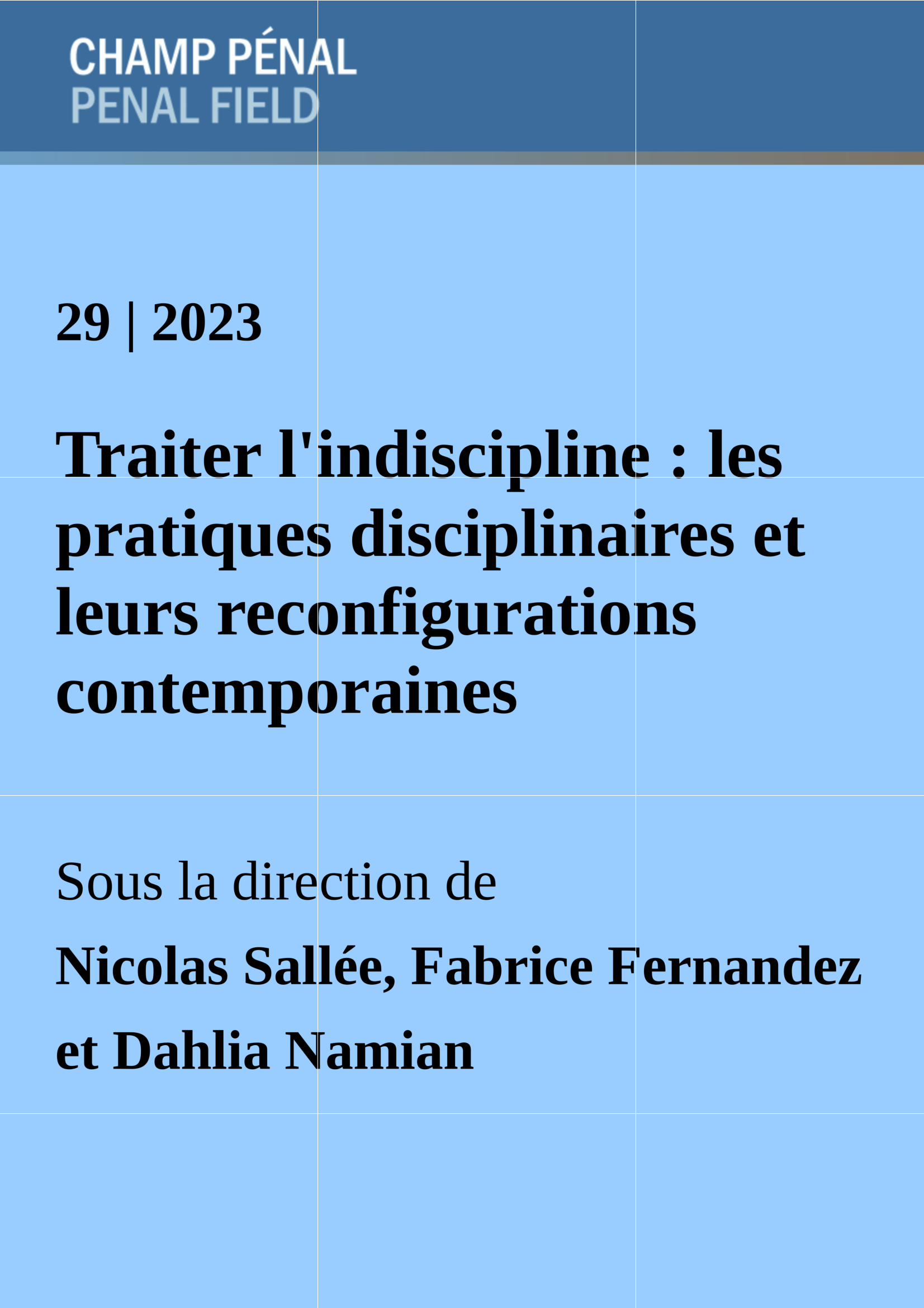 Nicolas Sallée, Fabrice Fernandez et Dahlia Namian (dir.), « Traiter l’indiscipline : les pratiques disciplinaires et leurs reconfigurations contemporaines », Champ pénal, n° 29, 2023.
